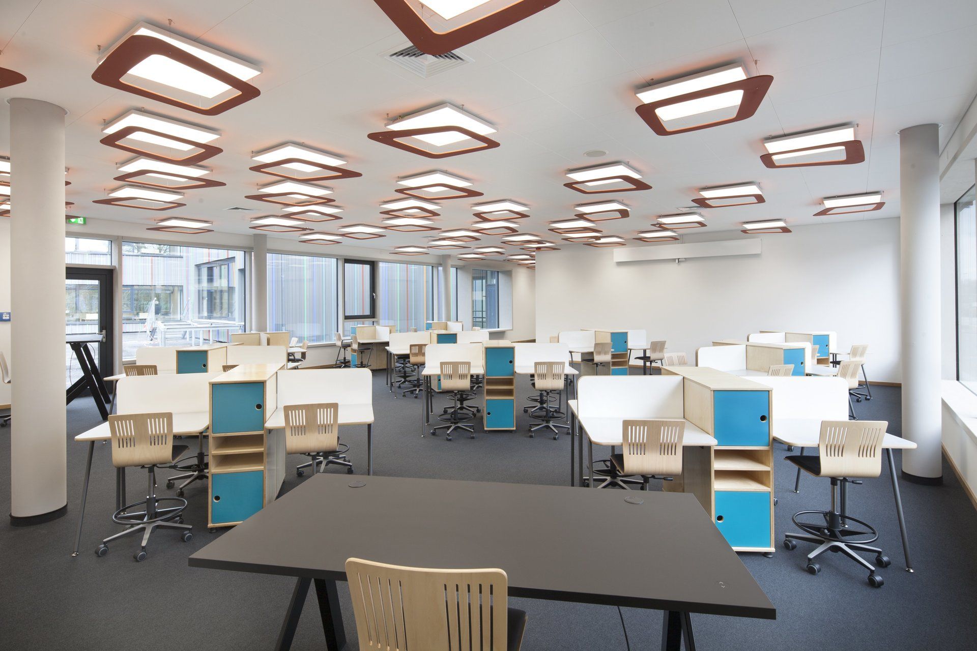 An den Wir-Raum, der die ankommenden Schüler*innen, Lehrer*innen und Gäste willkommen heißt und als Aula und Veranstaltungsort dient, schließen sich zwei Lernlandschaften im Erdgeschoss und zwei im ersten Stock an.